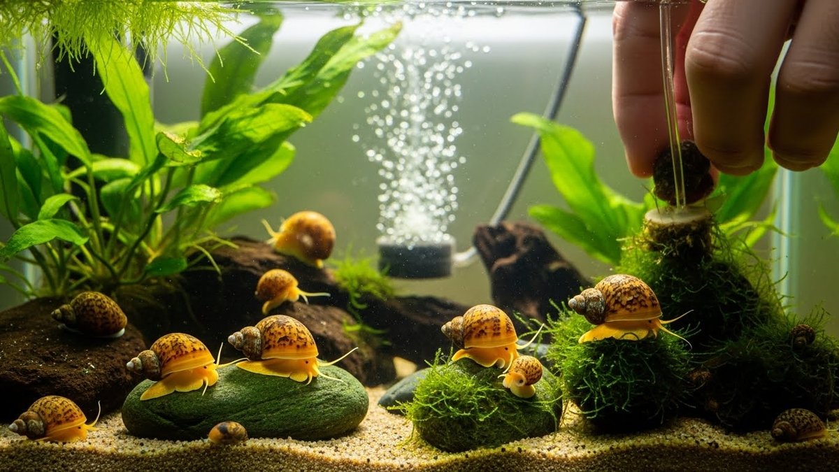 場合によっては他の掃除役の導入や、ブラシで軽くこすって取り除く手段を併用します。ただし貝殻や生体を傷つけないよう注意してください。